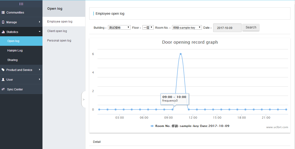 Select 'Statistics' => Choose building => Choose floor => Choose room number => click 'Search' to check the opening record and details.